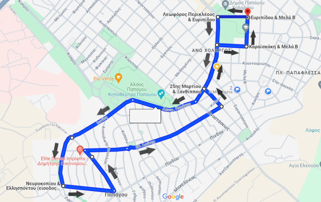 Παπάγου - Ιωνίας - Νευροκοπίου - Ελλησπόντου - Αργυροκάστρου - Εθνικής Αμύνης - Ξανθίππου - επιστροφή στον τερματισμό).