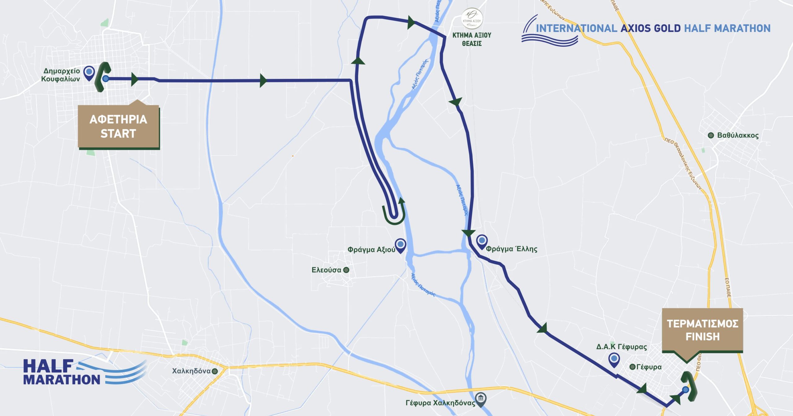 Διεθνής Ημιμαραθώνιος, Μέλος AIMS· Πιστοποιημένη διαδρομή WORLD ATHLETICS· Εκκίνηση: Δημαρχείο Κουφαλίων, Τερματισμός: Στρατιωτικό Μουσείο Βαλκανικών Πολέμων (Τοψίν).