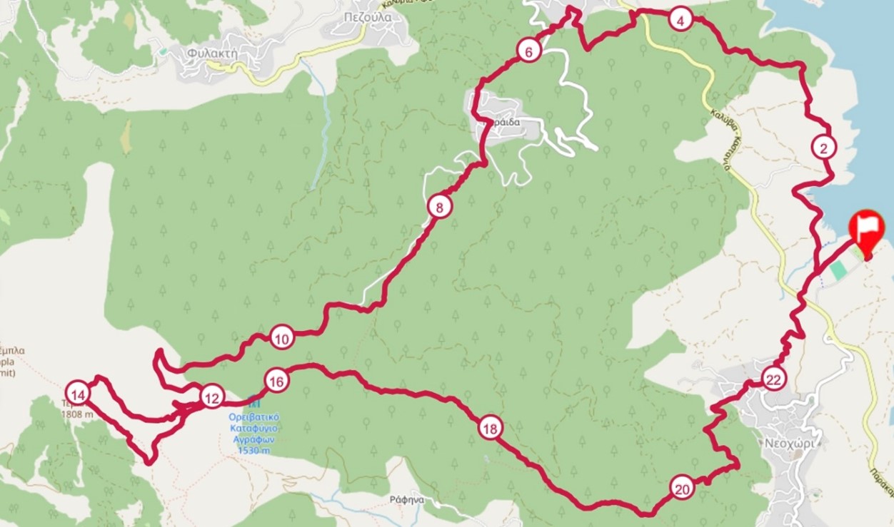 Μικτή διαδρομή με +1150μ: 5χλμ επίπεδα, 5χλμ ανηφορικό μονοπάτι (+700μ), 2,5χλμ άσφαλτος (+150μ), χωματόδρομος και ανάβαση από την πίσω μεριά στην κορυφή Τέμπλα (+250μ, υψηλότερο σημείο 1808μ), στη συνέχεια τεχνική κατάβαση προς καταφύγιο και επιστροφή μέσω Νεοχωρίου στο σημείο εκκίνησης/τερματισμού.