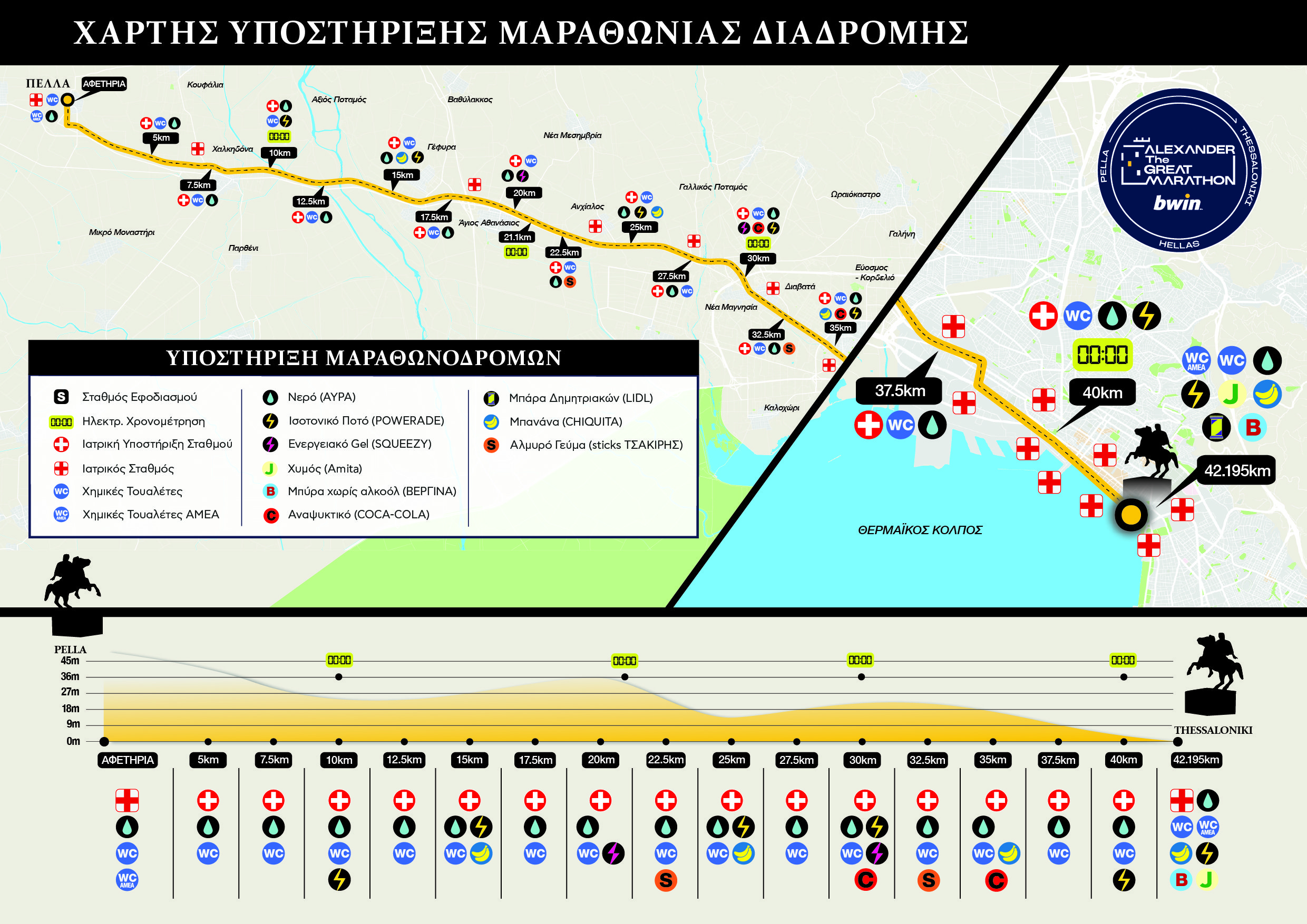 Historic 42.195km route from Pella (ancient Macedonia's capital, Alexander the Great statue) to Thessaloniki waterfront (Megalou Alexandrou Ave).