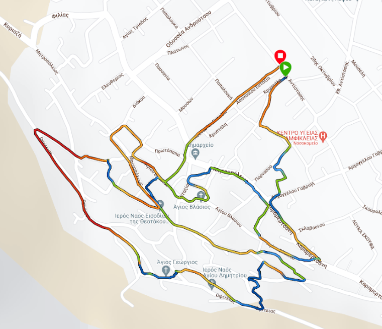 Age 15+; urban trail through cobblestone streets and alleys of historic Amfikleia with vertical and downhill sections; elevation gain 150m+; bib pickup Sat 25/4 16:00-18:15; medals for top 3 men and women.