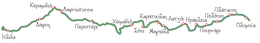 Route passes through 13 villages: Dafni, Keramidia, Dafniotissa, Peristeri, Cheimadio, Sopi, Karatoula, Magoula, Latzoi, Pournari, Pelopio, Platano.