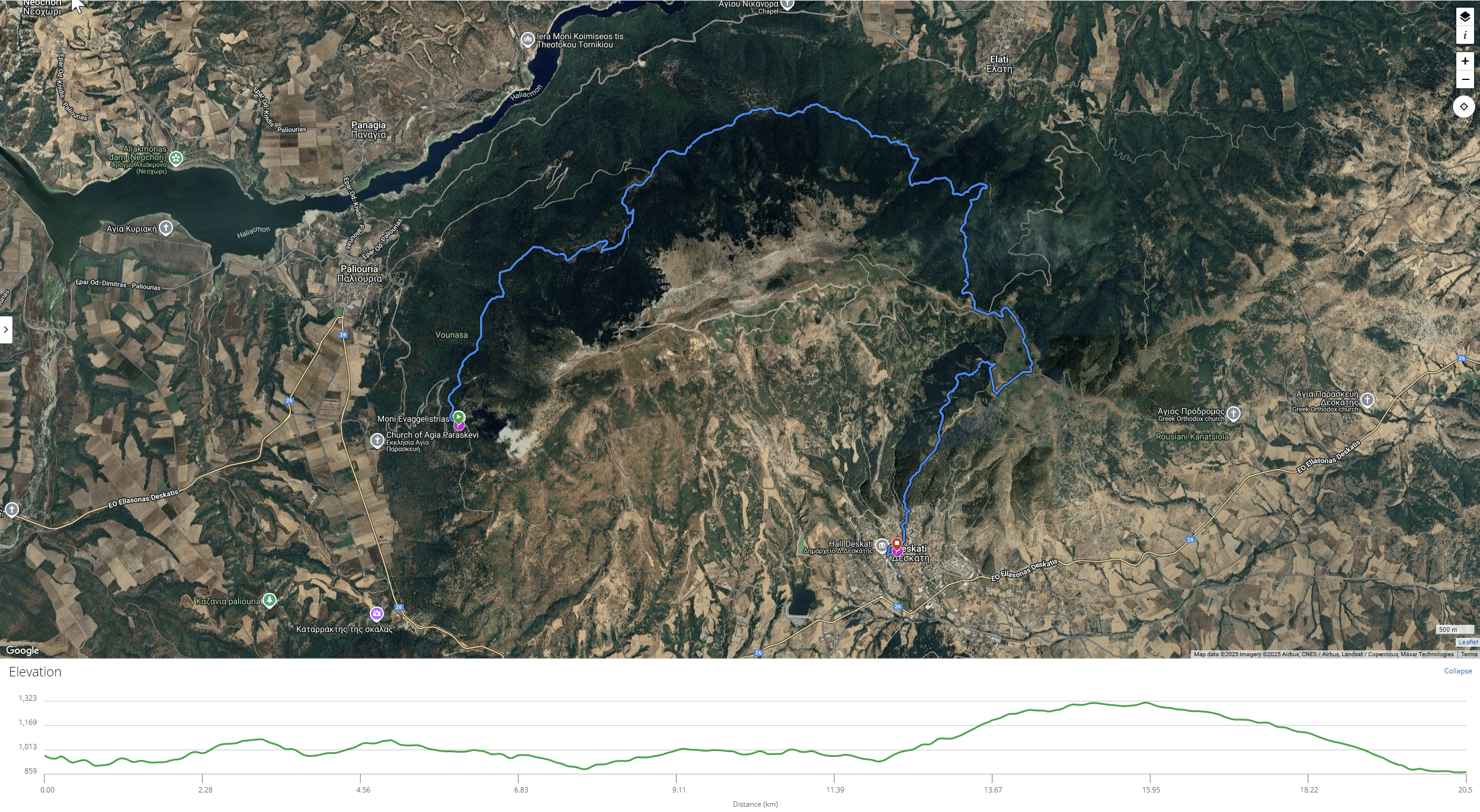 Start: Grounds of the Holy Monastery of the Annunciation of Theotokos Bounasia (Ιερά Μονή Ευαγγελισμού Θεοτόκου Βουνάσιας), altitude 991m.